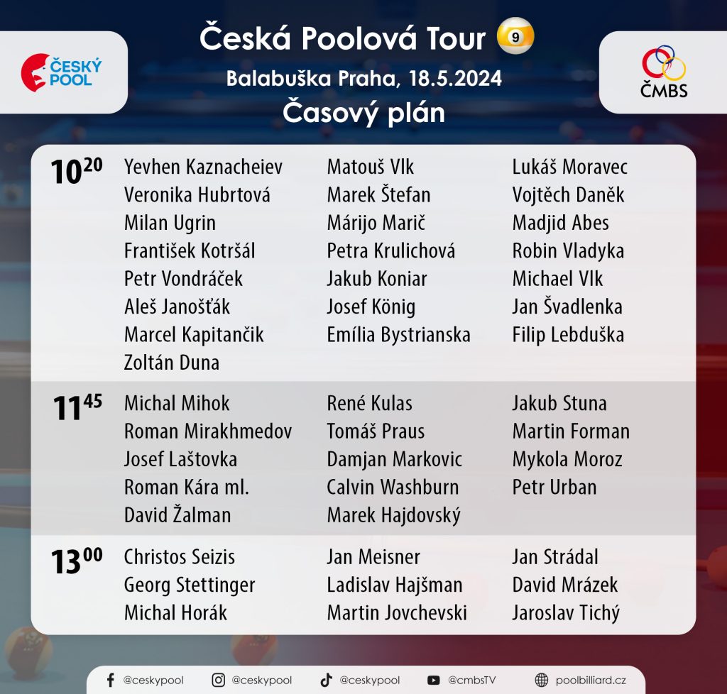 Podrobnosti v našem kalendáři na rok 2024 a v přihlašování na turnaje na cmbs.cz nebo na poolbilliard.cz.
