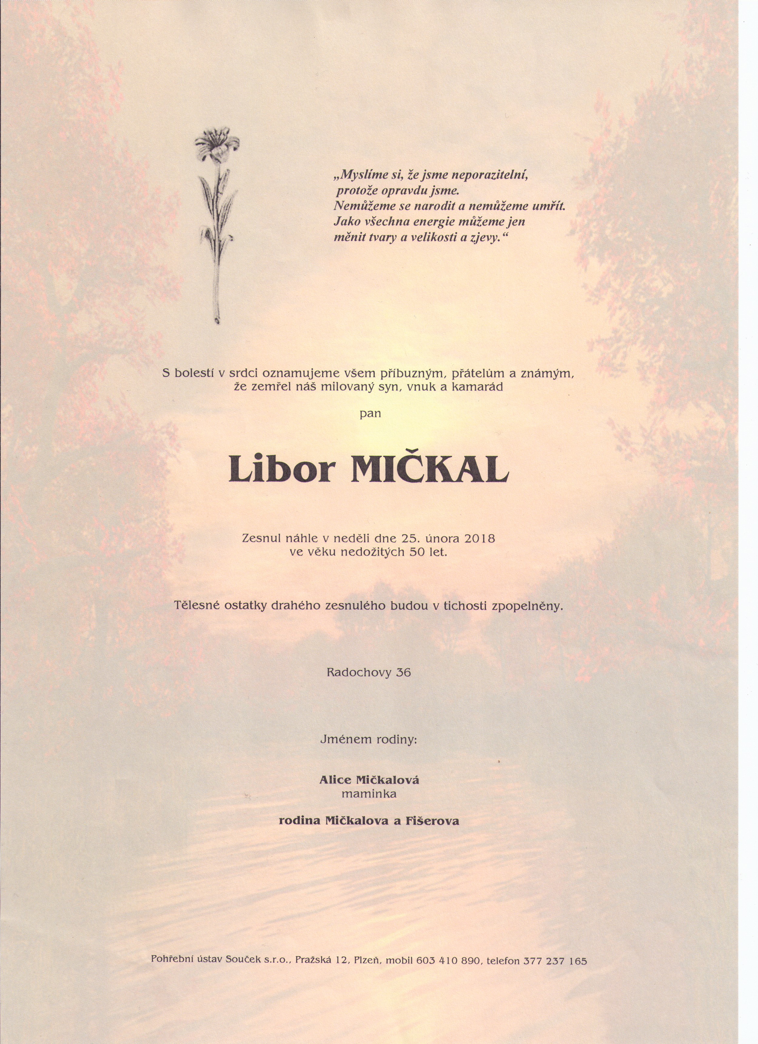S hlubokým zármutkem oznamujeme všem přátelům a známým, že v neděli 25.2.2018 zemřel Libor Mičkal. Odešel nečekaně ve věku 49 let. Libor byl aktivním členem Billiard Clubu Příchovice. Podílel se na činnosti klubu, závodil na turnajích a věnoval se trénování mládeže. Mnohým zůstane v paměti také jako umělec a autor řady krásných a zajímavých obrazů.