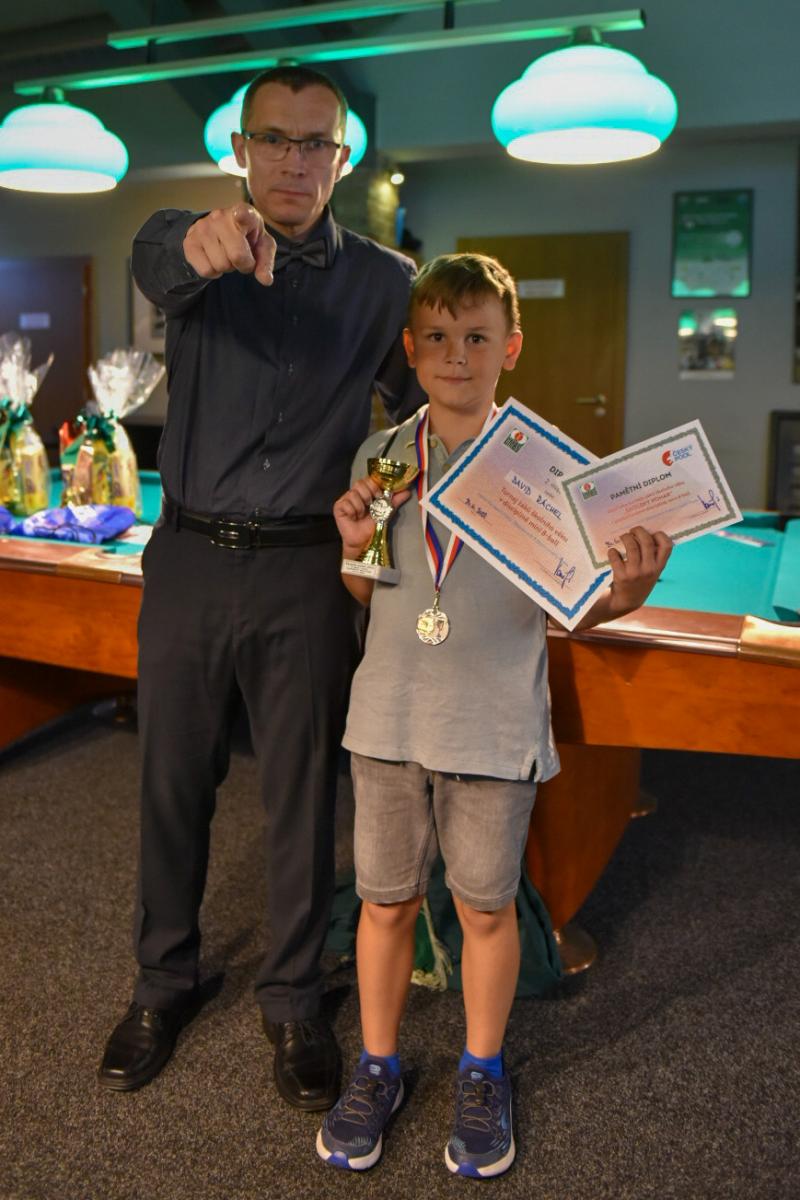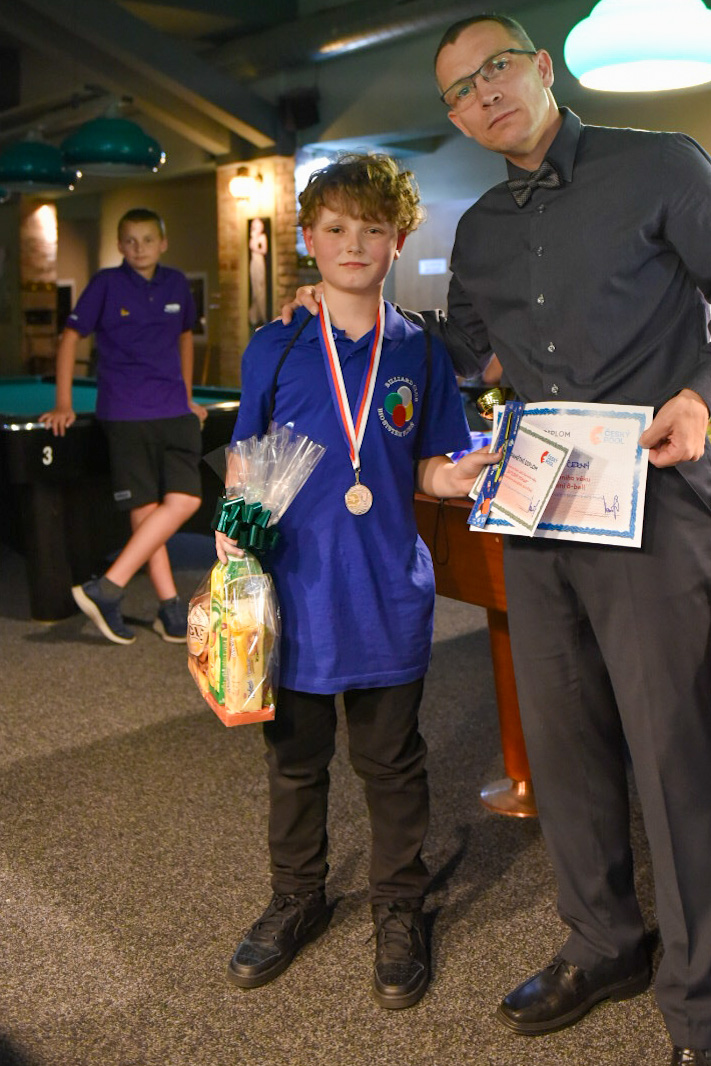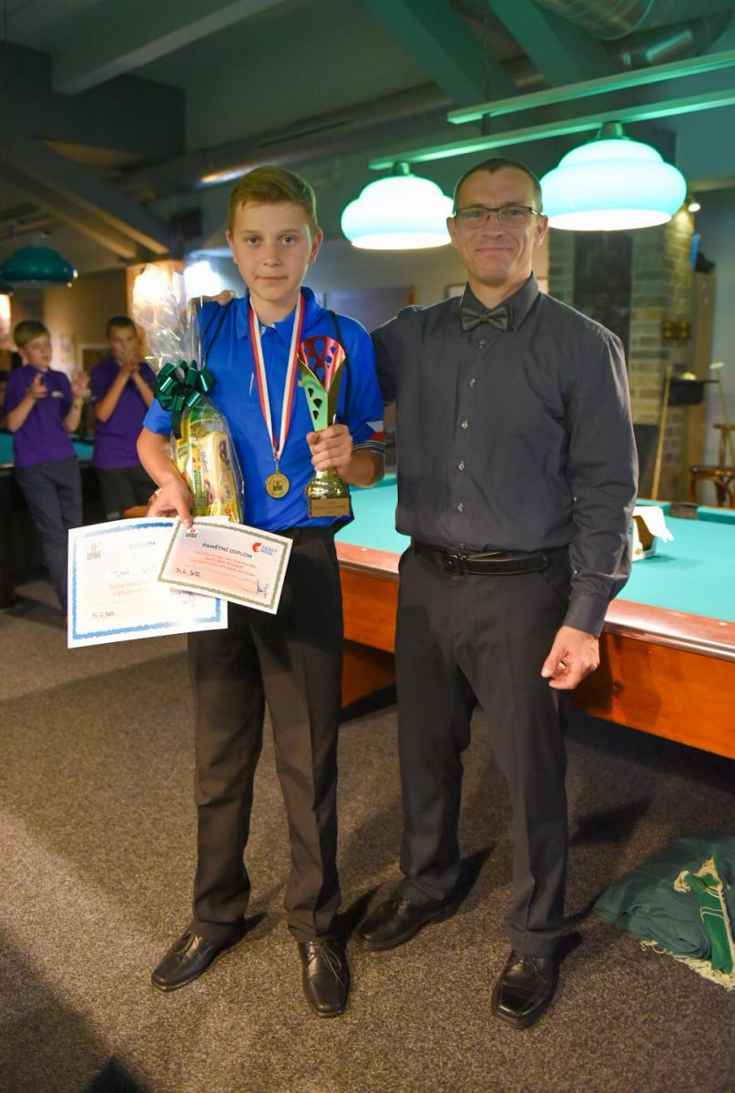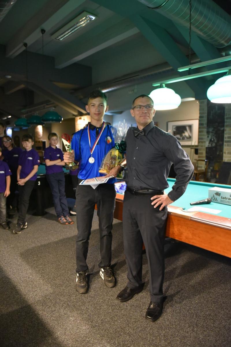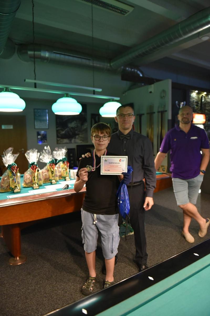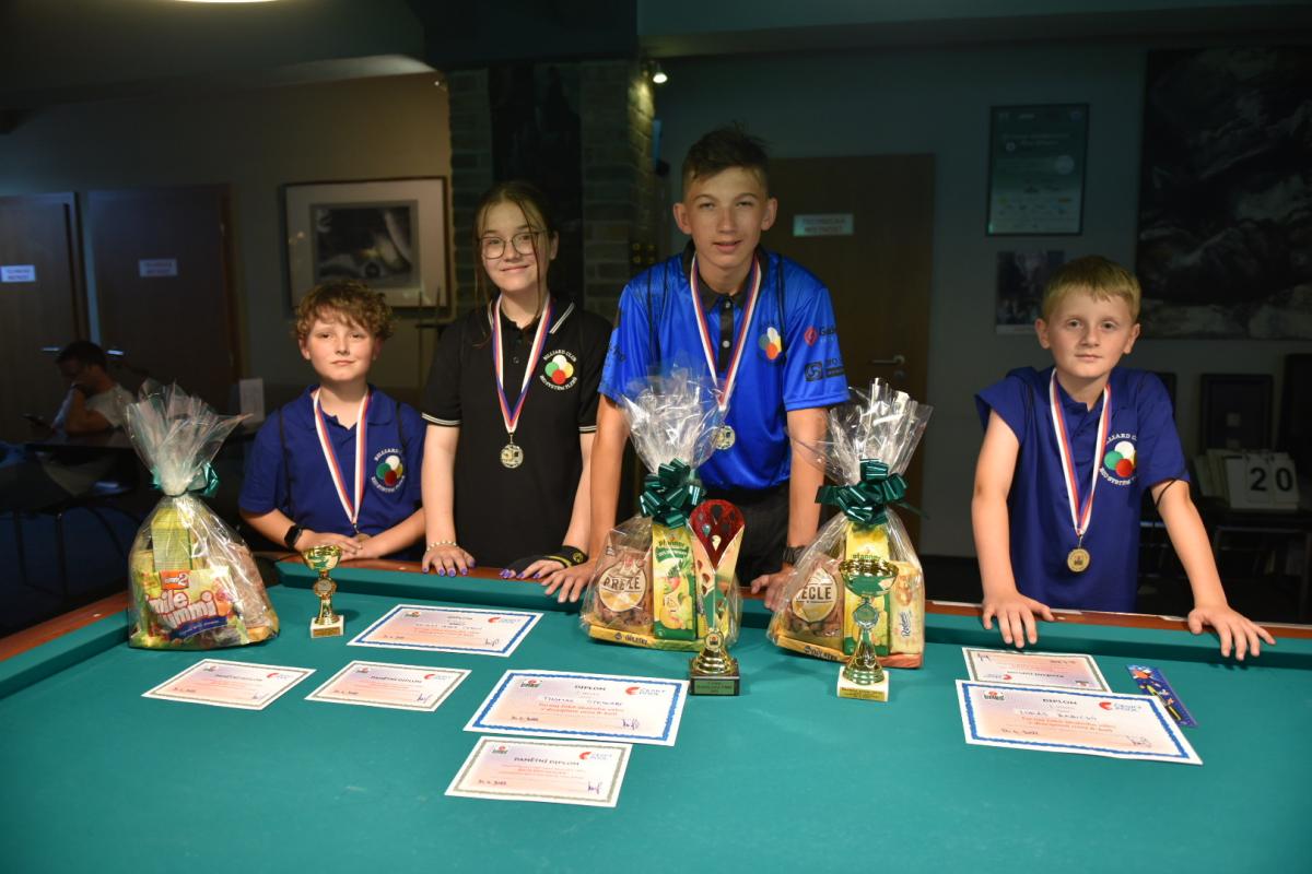 Pro zápasy v single KO pavoucích však jako by se dětem vlily do žil nové síly a bylo se na co koukat. Zejména fakt, že se bojovalo o možnost získání medalí, měl velký vliv na hru jednotlivých dětí. Průběh her, přístup dětí a jejich výkony byly celkově více nervózní a současně s rozvážnější. Bylo velice zajímavé, jak se hra s přibývajícím tlakem mění. Nechci a nebudu zde vyzdvihovat a popisovat výkony jednotlivých hráček a hráčů, všichni jste byli skvělí. Po 7,5 hodinách hraní zvítězil v kategorii kadetů výborně hrající Lukáš Babický (Billiardový klub Bio-Systém Plzeň z.s.), když ve finále porazil 21 – 12 Davida Ráchela (SK Billard Centrum Praha, z.s.), na třetím místě se umístil Nicolas – Oliver Černý (Billiardový klub Bio-Systém Plzeň z.s.) když v těsném zápase rozhodl opkovanou poslední hrou o svém vítězství 17 -13 nad Elisabet Vlasákovou (TJ Sokol Hodonín). Elisabeth se nakonec stala v této kategorii nejlepší dívkou. V kategorii juniorů získal první místo Tomáš Kurz (Řipská Billiard club), když ve finále porazil poměrem 30 – 18 Thomase Stewarta (Billiardový klub Bio-Systém Plzeň z.s.). Na třetím místě se umístila Nataly Vlasáková (TJ Sokol Hodonín) po vítězství 17 – 9 nad Laurou – Marií Černou (Billiardový klub Bio-Systém Plzeň z.s.), kdy si současně vybojovala ocenění v této kategorii ocenění „nejlepší dívka“ GRATULUJEME !